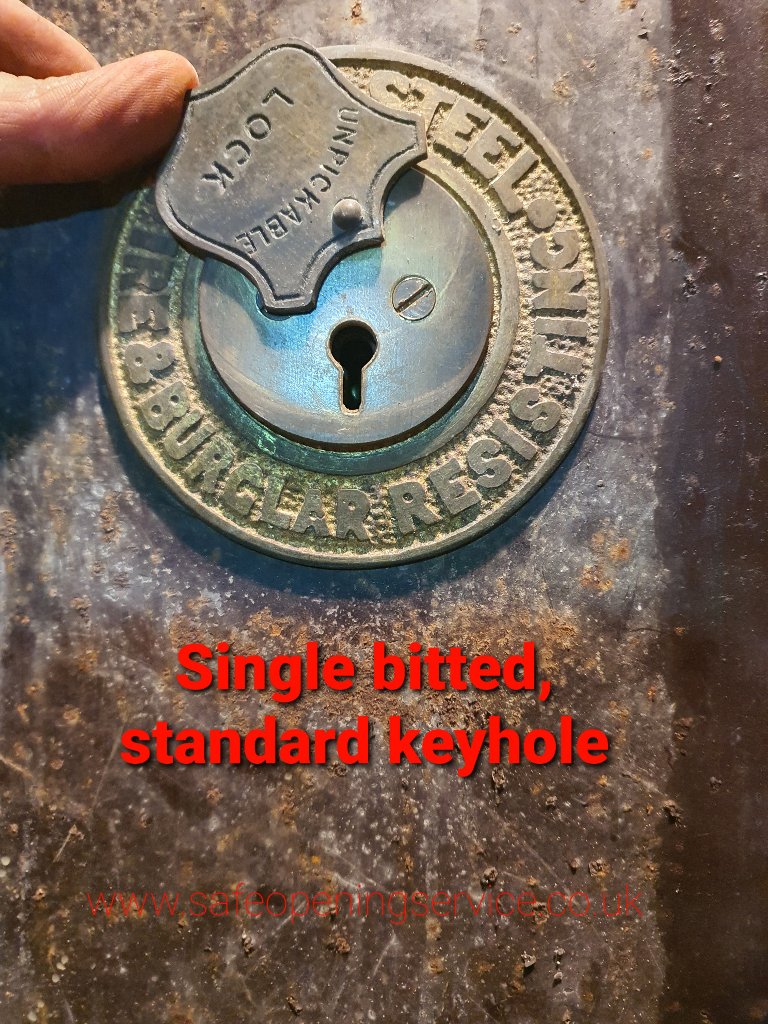 Some examples of keyholes used by safe manufacturers. Milner and Ratner used similar locks with very distinctive keyways. If you imagine a clock face then one slot points to 7 o’clock and the other to 11 o’clock. When locked the key only goes into the 7 slot, once unlocked the key only fits into the…