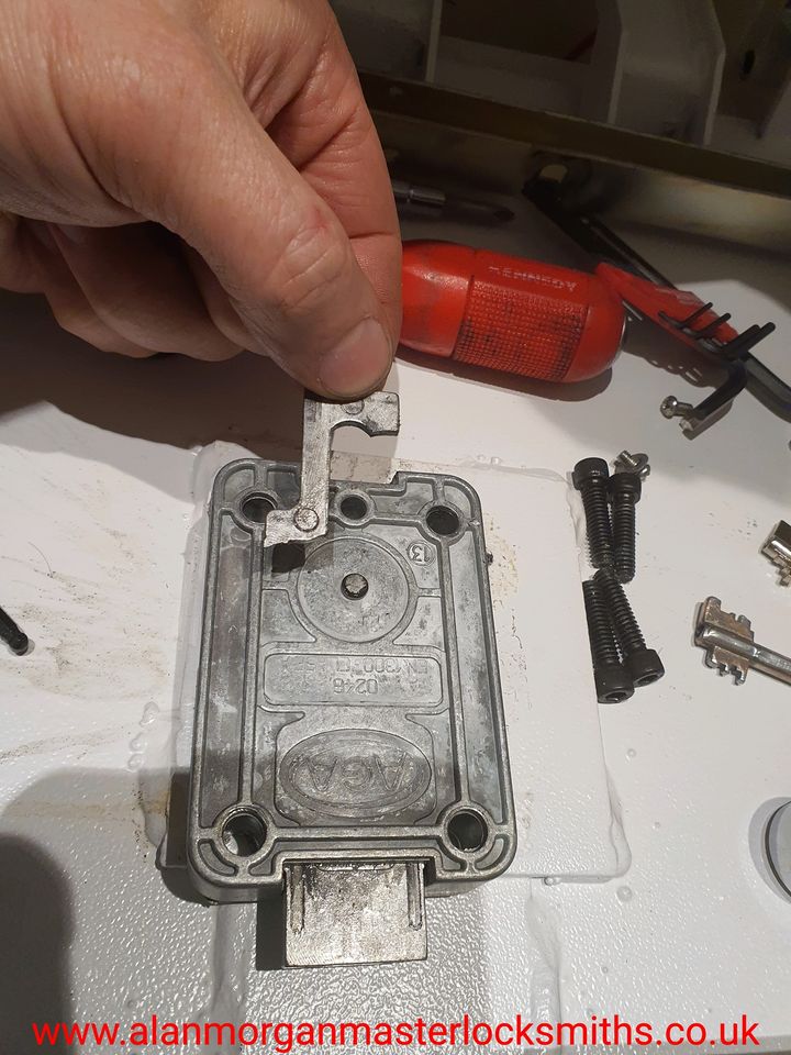 Customer unable to open Phoenix SS1180 Fortress safe with key. Even smaller safes need servicing occasionally, only one screw left holding boltwork together so a lockout was imminent. But before that caused a problem, this component inside the lock snapped. The key turned but safe stayed locked. #Safecracking near Northampton. Opened and repaired with new lock from…