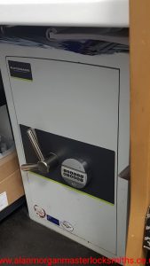 Burton Eurovault Aver safe locked out due to boltwork failure over in Stoke. Handle would turn but the safe wouldn’t open. Pictured here AFTER the repair, we had to drill several holes to gain entry. All repaired with new parts from stock and the holes made good so you can’t tell we were ever here. Professional safe engineers Alan Morgan Master Locksmiths. We can save your safe.