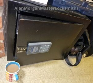 Chubb Black Box safe with Mauer Code Combi electronic digital combination lock and a lovely coffee. After 12 years of trouble free operation part inside worked loose causing a lockout, safe opened and reinstated with upgraded bolt work for many more years service.