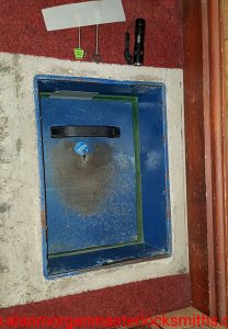 Churchill Bulldog under floor safe opened near Immingham. Lack of servicing led to part of the boltwork detaching which locked the door shut even when the key turned. Even this catastrophic failure can be remedied if you call in a professional. A little precision drilling enabled Alan Morgan Master Locksmiths to manipulate the faulty parts and get in. Permanent repairs were made and their safe put back into service. safecracker on tour Humberside.
