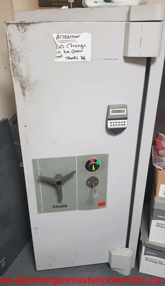 Before and after photos showing the new keypad with screen. This solution was chosen by a client who needed to add time lock to their safe. Now it cannot be opened when the business is closed. Reduces the risk of staff being kidnapped and forced to let criminals in, stops sacked workers from getting in out of hours even if the code wasn’t changed. Multi window and immediate time lock functions, time delay feature, multiple user codes with audit. Review your cash office security protocols. www.amlocks.com
