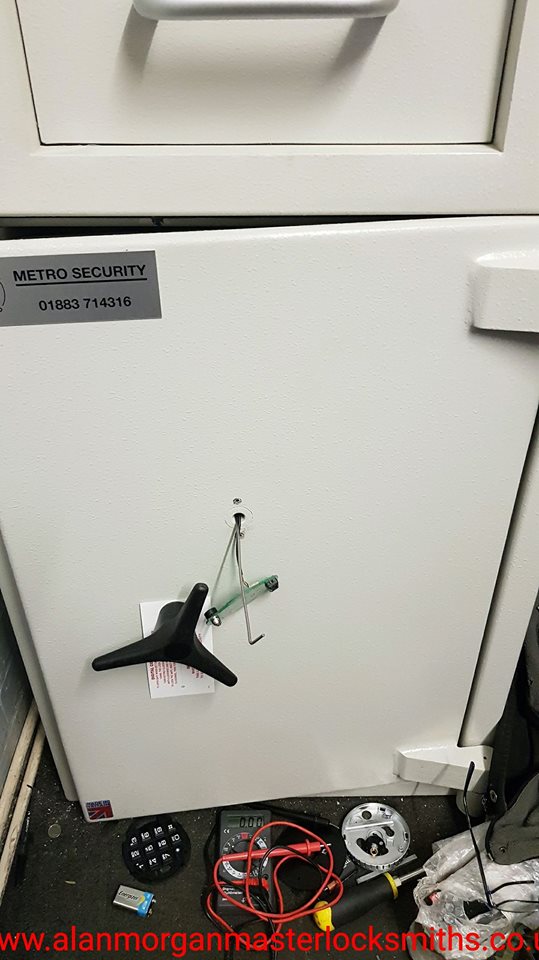 Dudley safe opened in Nottingham. Electronic digital combination safe lock stopped working. Opened via the cable hole with a bit of Morgan magic. New lock fitted from stock to get this safe working again in one visit. Professional safe engineers. We can save your safe.